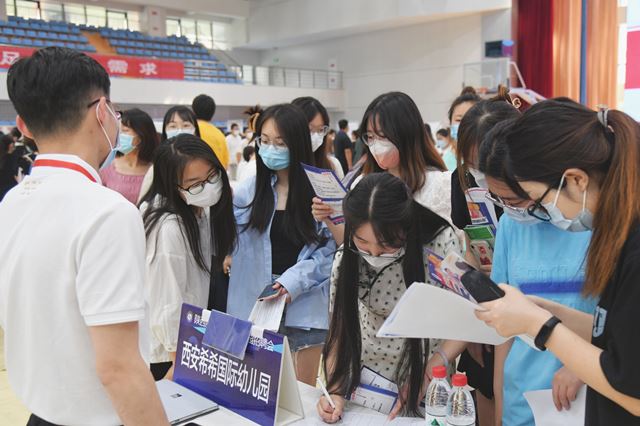 陕服新闻网讯(李文斌)为进一步提升毕业生就业质量,解决毕业生就业困难,我校5月21日在体育馆举行2022届毕业生校园招聘会。校就业工作领导小组成员、毕业班辅导员参加了本次活动。比亚迪、报喜鸟控股、杜克普服装有限公司、九牧王男装、淳化县实验幼儿园等 95家用人单位前来招聘,提供就业岗位4300多个,2022届毕业生分批分次进入体育馆参加现场求职。