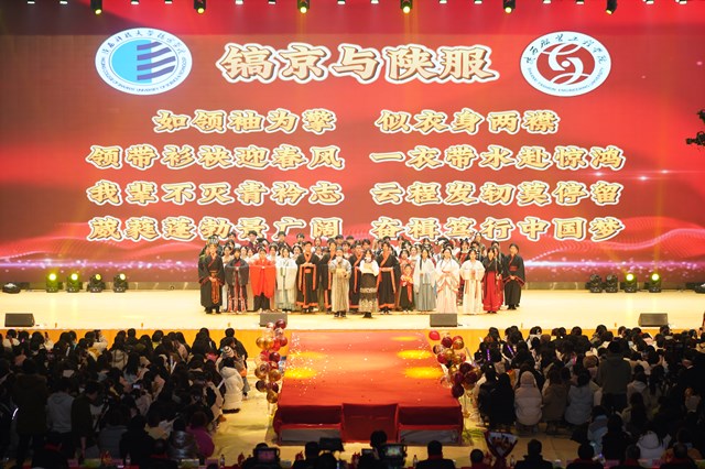 “挺膺担当新征程 奋楫逐梦向未来”主题晚会在舞龙舞狮《飞龙醒狮耀中华》和开场舞《辉煌中国梦》中拉开序幕。整场晚会分为三章:第一章奋斗正当时·笃行;第二章你我创新篇·共赢;第三章迈向新征程·绽放。内容涵盖拉丁舞、快板、歌伴舞、礼仪展示、古典舞、歌曲串烧、民族舞蹈、杂技、校园华尔兹、诗歌朗诵、街舞、服装走秀等节目。各类节目注重优秀传统文化的传承与创新,展示三校教学和艺术教育、美育教育成果、传统文化、校风校貌,同时深度挖掘锻造强化我校服装艺术特色。礼仪展示《华夏衣冠千秋礼》、服装走秀《寻迹》彰显了三校服装、艺术与教育的科研教学最新成果,在教育界和服装行业产生了积极反响。