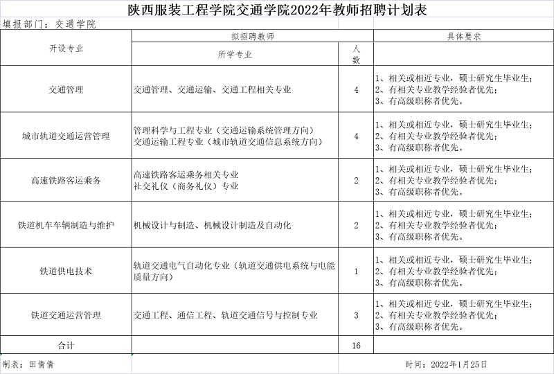 陕西服装工程学院交通学院2022年教师招聘公告