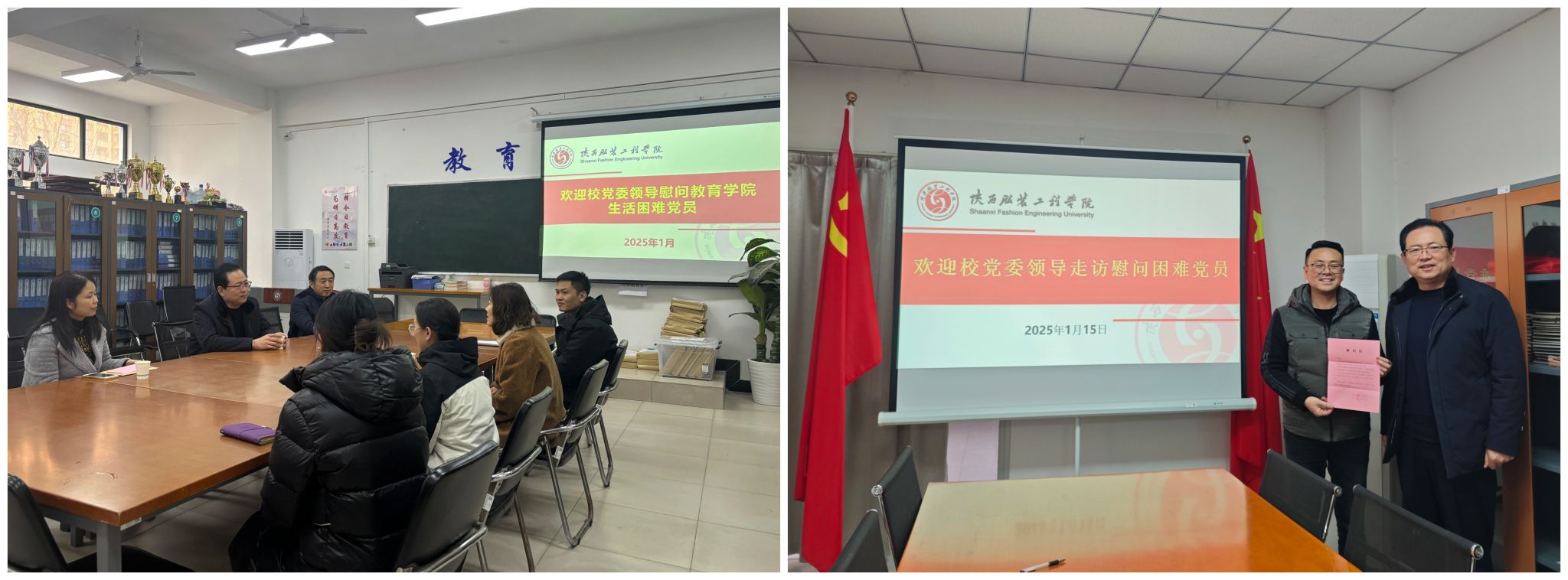 陕服新闻网讯(刘萍)1月15日,校党委副书记刘继兵、党委组织部部长伍建成、副处级组织员刘萍分别到教育学院、经济管理学院、服装学院、健康学院、信息工程学院走访慰问5名生活困难党员,代表省委教育工委、校党委向他们致以亲切的问候和新春祝福,并为他们送去了慰问信和慰问金。